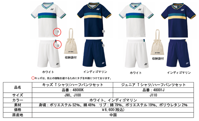 ウェアは、子どもは肌が弱く、発汗による体温調整を行うため、大量に汗をかくことを考慮して吸水機能を備えた肌触りの良いソフトで安全な綿混素材を採用。キッズ向け製品は、肌との接触を避けるためにタグを外側につけております。
