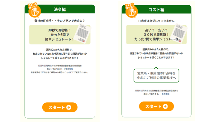 現在の想定している運用が、事業法のIT点呼規則に合致しているか判断できないという声を多く聞きます。どんな運用ならOKなのかNGなのか? を「はい」「いいえ」を答えるだけで簡単にシミュレーションできます。また、現在使用している機器に何を追加すればIT点呼を始められるのか、投資費用も「はい」「いいえ」に答えるだけでシミュレーションできます。