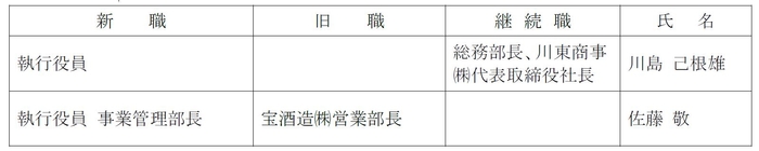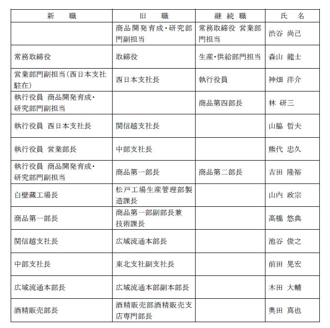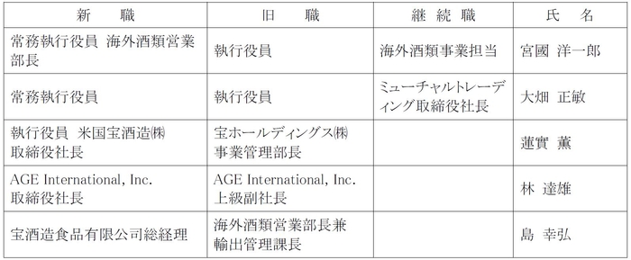 人事異動のお知らせ2024-02-15 16:30宝ホールディングス株式会社宝ホールディングス株式会社およびグループ会社では、4月1日付で人事異動をおこないます。 ◆宝ホールディングス株式会社 【人事異動】◆宝酒造株式会社 【人事異動】◆宝酒造インターナショナル株式会社 【人事異動】