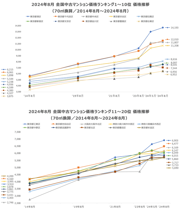 「不動産×WEB×ビッグデータ」の領域で、さまざまな不動産テックサービスを展開する株式会社ワンノブアカインド(本社:東京都港区、代表取締役社長:川島 直也、以下当社)は、当社が運営するマンション情報サイト「マンションレビュー」の保有データを元に、2024年8月の全国市区町村における中古マンションの相場を調査。坪単価をベースに70㎡の価格に換算した「中古マンション価格」*1と価格ランキング上位20件について過去10年間の価格推移、および1年前からの価格上昇率を表す「騰落率」のランキングを発表いたします。