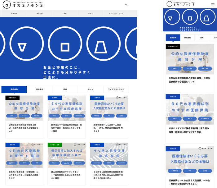 「オカネノホンネ」では、専門家の協力を得ながら組織やテクノロジーの力を活用し、「顧客本位」の視点で、生活者が知りたい本当の情報「ホンネ」の情報提供をしていきます。まずは、保険の中でも契約件数が多く公的な制度とも密接にからむ医療保険を中心に情報提供を行い、将来的には、保険商品全般・投資・ローン・ライフプランに関する情報を提供していきます。