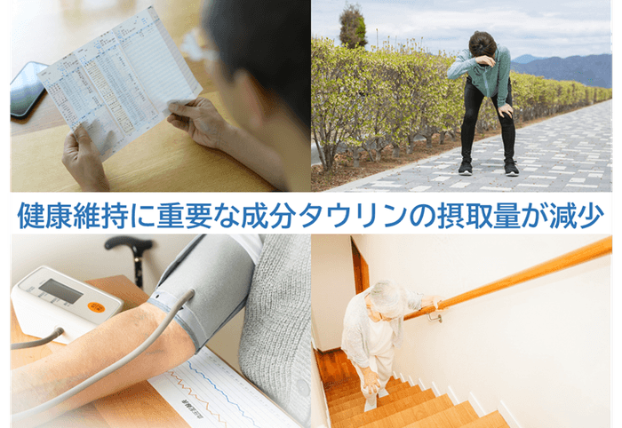 当社は長年に渡り、タウリン研究を行なってきました。最新の研究では、タウリンを約300mg/日程度摂っている中高年者は、約100mg/日程度の人に比べ脚の筋力を維持できている事が分かりました※1。タウリンは魚介類に多く含まれますが、人間の体内にも体重の0.1%に相当する量が存在しています※2。また、タウリンは、コレステロールを減らす、高血圧の予防などに効果があると言われているほか※2、約300mg/日摂るとメタボリックシンドローム予防につながるとの報告※3もあります。