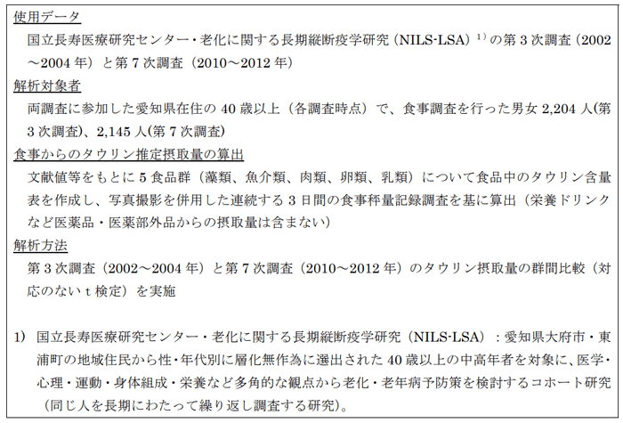 そこで今回、国立研究開発法人 国立長寿医療研究センターが保有するデータを解析することにより、日本人の中高年者(40歳以上の男女)のタウリン摂取量の年次推移を初めて推定しました。