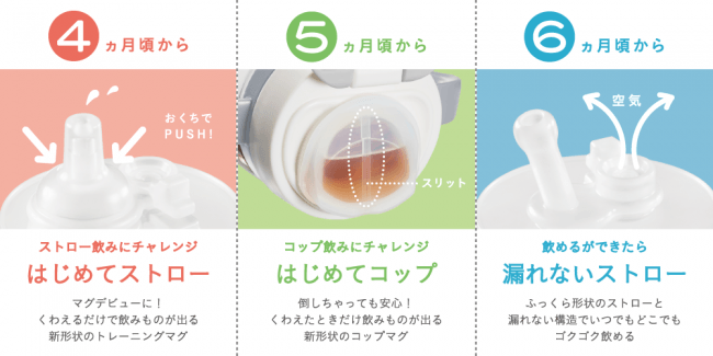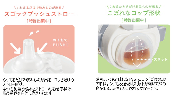 本製品は、新開発のくわえるだけで飲み物が出る形状の飲み口で、ストロー飲み、コップ飲みトレーニングが早くから始められるようになりました。さらに、キャップがしっかりと締まる「Wラクピタ構造」に加え、飲み口とパッキンを一体形状にすることで、ママの悩みでもあった漏れの原因そのものを解決しました。