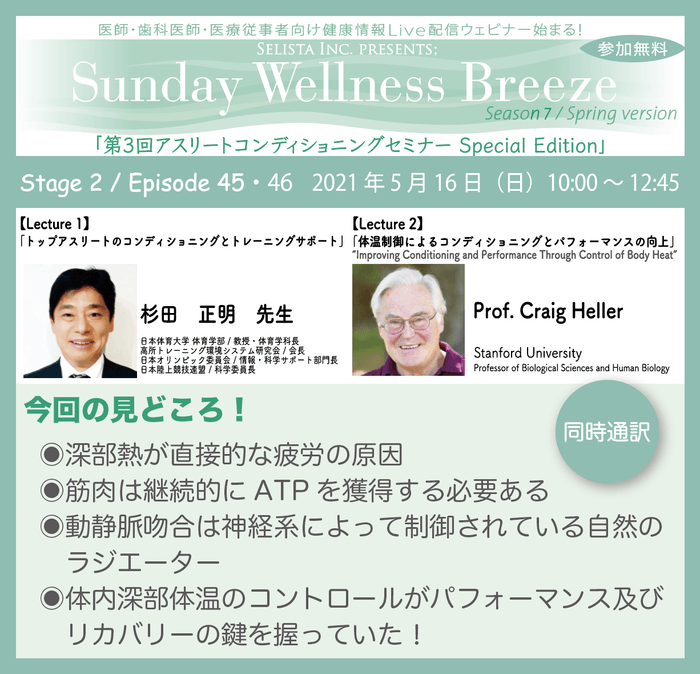セリスタ株式会社(東京都千代田区、代表取締役:伊藤 承正)は、2021年5月16日(日)に無料オンラインウェビナー「Sunday Wellness Breeze Season 7」のStage 2として『第3回アスリートコンディショニングセミナー』を開催します。