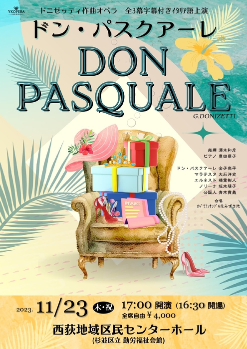YKOPERA企画主催、『ドニゼッティ作曲オペラ「ドン・パスクアーレ」全3幕字幕付き原語上演』が2023年11月23日 (木・祝)に西荻地域区民センターホール(杉並区立勤労福祉会館)(東京都杉並区桃井4丁目3番2号)にて上演されます。チケットはカンフェティ(運営:ロングランプランニング株式会社、東京都新宿区、代表取締役:榑松 大剛)にて発売中です。
