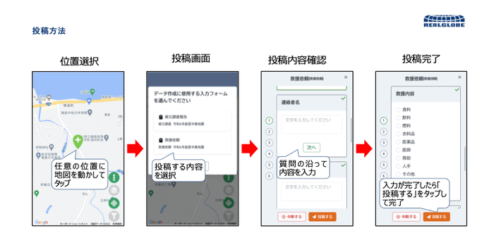 株式会社リアルグローブ(所在地:東京都千代田区、代表取締役社長:大畑 貴弘、以下 リアルグローブ)は、令和6年8月の台風10号の影響による災害をうけ、被害を受けた地域に、スマートフォンを活用し、リアルタイムに情報を報告・共有を可能にする「現場情報投稿システム REPORT&SHARE」を、被災状況の調査及び復旧復興に携わる自治体に、本日より無償提供を行います。