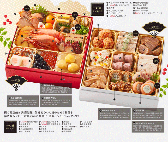 伝統的なおせち、肉料理、魚料理を和洋バランスよく詰め合わせたSONOKOのおせち重。お祝いの席にふさわしい紅白のお重箱です。