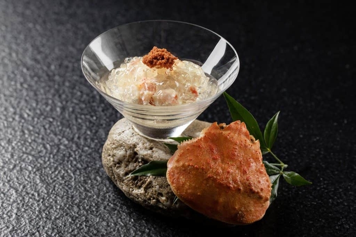 冬の風物詩である香箱ガニの甘くしまった身と、風味豊かな内子、外子を使用した前菜です。フロマージュブランと、牛乳でやわらかくなるまで炊き、甘味を増した米を合わせまろやかな味わいに仕立てています。上に乗せたシャンパンビネガーのジュレのしっかりとした酸味が、それぞれの素材の味わいを際立たせます。