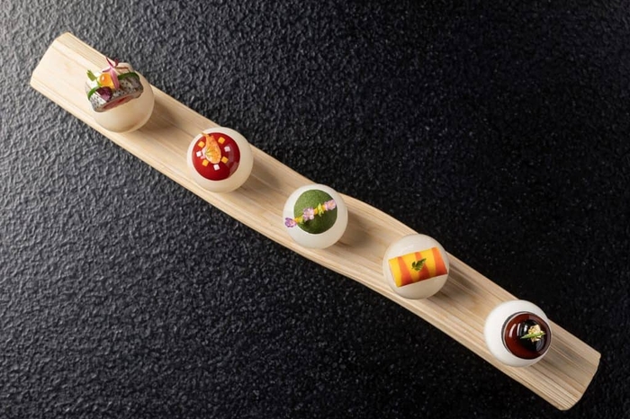 料理長・浜田の代表的な料理の一つです。五味(酸・塩・苦・辛・甘)をそれぞれ小さな料理に詰め込み、繊細な技術で表現しています。一つ一つの料理の味付けに、柿酢や酒粕、かんずり、豆腐ようなど、日本で古来より親しまれてきた発酵食品を取り入れています。