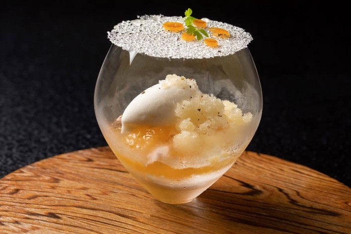 みずみずしく柔らかい果肉を持った柑橘「紅まどんな」を主役にしたデザートです。果肉そのものに加え、果汁を凍らせたグラニテや外皮をコンフィにしたものを使用することで、甘味や酸味、苦味といった紅まどんなの様々な味わいを楽しめます。生姜や日本酒ジュレ、ヨーグルトのアイスクリームといった食材を合わせることで、爽やかでさっぱりとした後味に仕上げています。