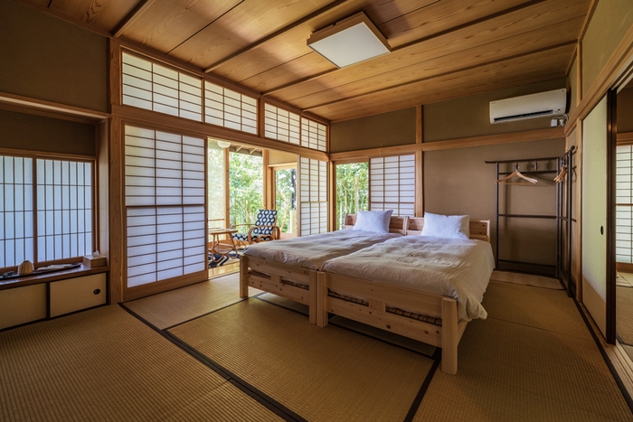 和風平屋建て5LDKの室内は、自然の美しさと和の風情が融合したデザインで特別な空間を演出。24帖の広々としたリビングルームには大きな窓が配置され、自然を感じられるあたたかな光が差し込みます。寝室は畳敷きの和室で日本の伝統的で上質なくつろぎをご提供します。和室から繋がる広縁からは、熱海の優雅な自然と海が広がる景色が楽しめます。
