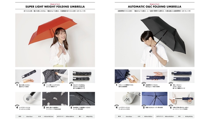 「Magical Tech(マジカルテック)」は、強度に優れた超極薄の生地に、独自開発した超軽量かつ丈夫なカーボン素材の骨を採用。重さを感じさせない、魔法のような軽さを実現。
