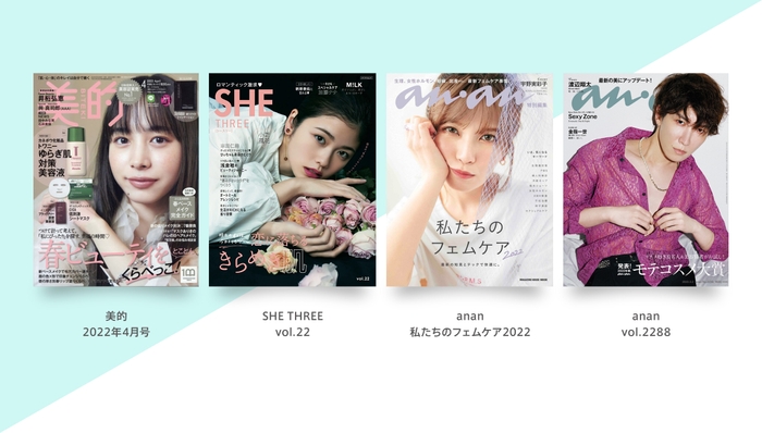 ●3月3日発売『anan 特別編集 私たちのフェムケア2022』(発行/株式会社マガジンハウス)の85ページで、「インクリア 3本入り&10本入り」、及び「アウトクリアシリーズ」の「ケアウォッシュ ムースタイプ」、「ケアウォッシュ リキッドタイプ」、「ケアパウダースプレー」を掲載していただきました。(PR掲載)