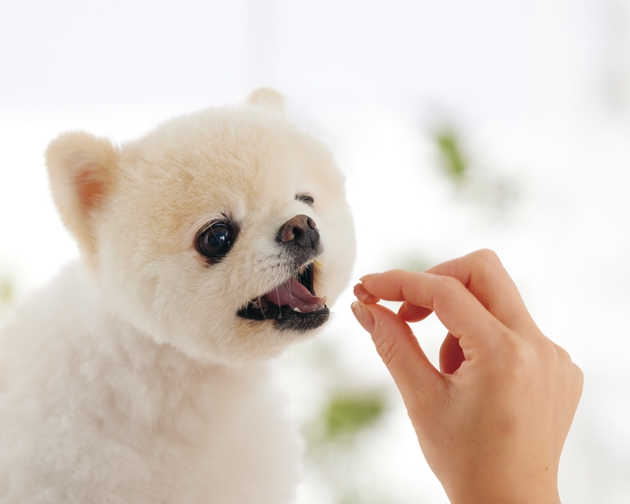 小型犬はひと口が小さく、飼い主は愛犬用おやつを割り小さくして与えています。