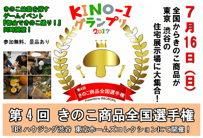 第4回きのこ商品全国選手権「KINO-1グランプリ2017」 7月16日(日)に東京都 渋谷で開催!