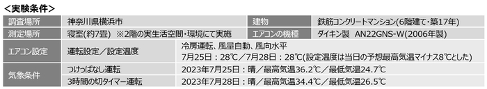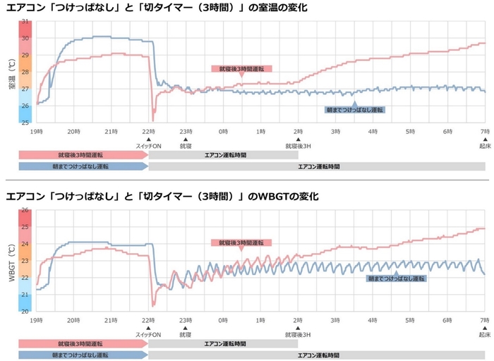 ダイキンは、マンションの寝室に設置されたルームエアコンを用いて、睡眠時にエアコンを「つけっぱなし」にした場合と「3時間の切タイマー」を設定した場合の「室温」と「暑さ指数(WBGT)」の変化を計測する比較実験を行いました。その結果、切タイマーを設定すると、エアコンが切れた後にはWBGT値が時間の経過とともに上昇し、明け方には熱中症への警戒が必要とされるWBGT値である25℃ほどになりました。外気温や住環境によっては、WBGT値がさらに高まることも考えられます。