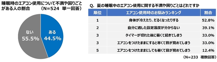 睡眠時のエアコン使用について2人に1人が不満や困りごとを抱える その第1位は「身体が冷えたり、だるくなったりする」