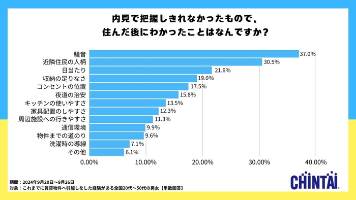 ・内見では把握しきれない課題では、「騒音」(37.0%)や「近隣住民の人柄」(30.5%)などが挙げられました。