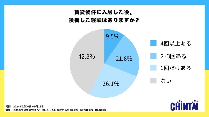 お部屋探しのリーディングカンパニー株式会社CHINTAI(本社:東京都港区 代表取締役社長 奥田倫也 以下CHINTAI)は、これまでに賃貸物件へ引越しをした経験がある全国の20代から50代の男女を対象に、引越し後の物件に対する後悔や早期退去の経験、内見で確認するお部屋の情報についてのアンケート調査を実施しました。