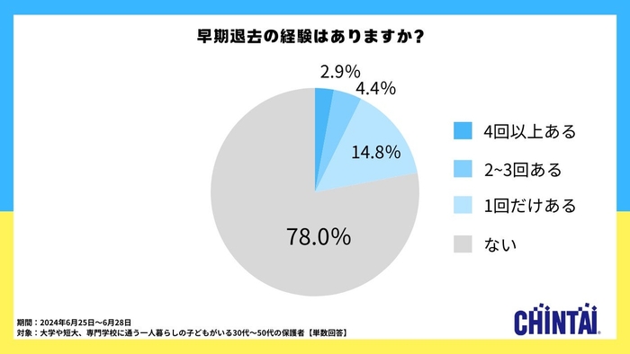 早期退去の経験がある人は全体の22.0%で、5人に1人が経験していることがわかりました。内訳は、「1回だけある」が14.8%で最も多く、次いで「2~3回ある」が4.4%、「4回以上ある」が2.9%となりました。一方、早期退去の経験が「ない」と回答した人は78.0%でした。