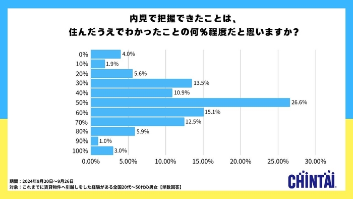 「内見で把握できたことは、住んだうえでわかったことの何%程度だと思いますか?」という質問に対し、最も多かった回答は「50%」で26.6%を占めました。次いで「60%」が15.1%、「30%」が13.5%と続き、多くの人が内見時点では、住んでみてからわかることの半分程度しか把握できていないと感じているようです。