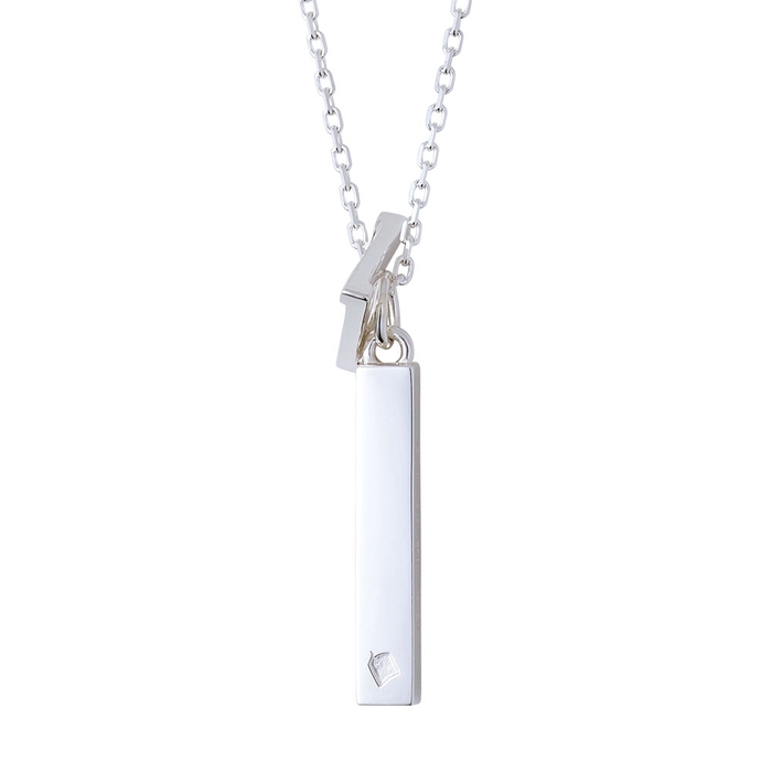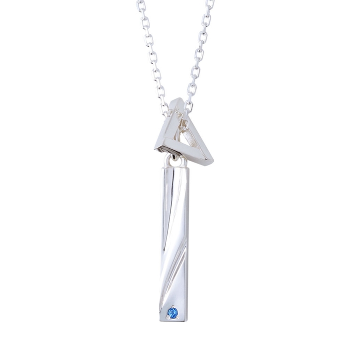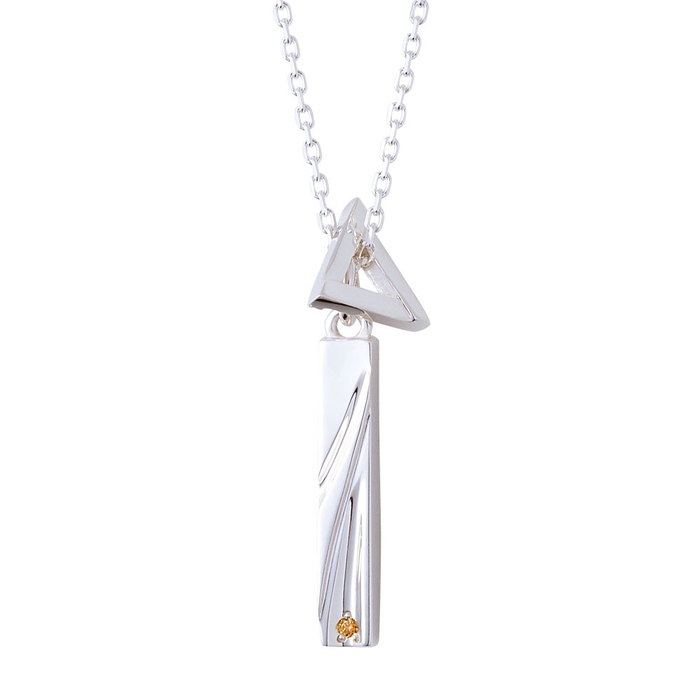 シンプルなバータイプのトップにイメージカラーストーンをセット。裏面にはヘッドフォンアイコンを刻印しました。作品をイメージした三角形チャームがポイントです。