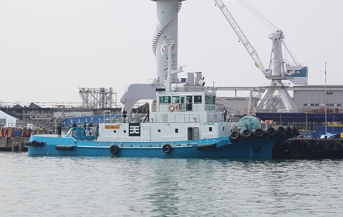 主に常石港内向けの作業船となる曳船「うつみ」は、THI建造初の小型船として昨年10月24日に進水、今年2月15日にTHIを出航、日本へ回航し曳航力試験等実施後、この日を迎えました。