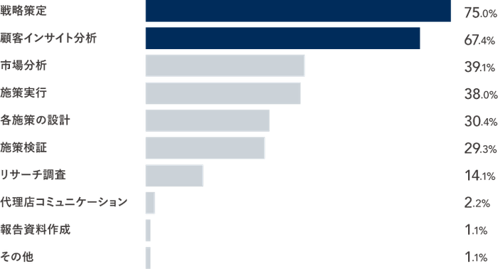 マーケター重要業務は、75%が戦略策定、67.4%が顧客インサイト分析と回答。戦略および顧客インサイト分析を最も重視している。