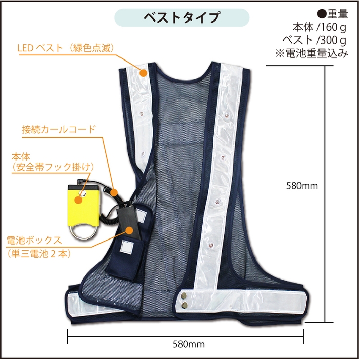 安全帯のフックを掛けるという手順を行うだけでパッド及びベストに内蔵されたLEDランプが点滅します。その都度電源スイッチの入切操作を行う必要もなく、作業員の手を止めずにスムーズな作業と安全確保を同時に実現しました。