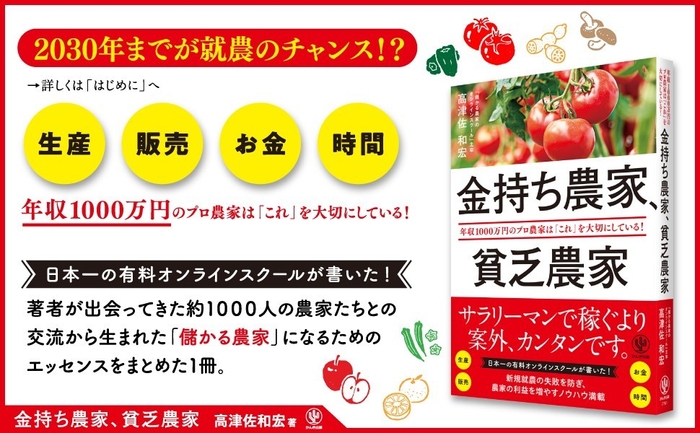 著者の高津佐和宏氏は、人気YouTubeチャンネル「農家の学校」を運営し、農業の有料スクールとしては日本有数の規模を誇る「儲かる農家のオンラインスクール」も主宰。