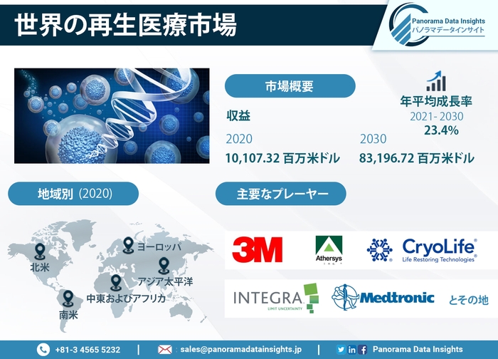 2020年には10,107.32百万ドルと評価されていた全球の再生医療市場は、2030年までに83,196.72百万ドルに急増する見込みです。これは2021年から2030年までの年平均成長率で23.4%を表しています。