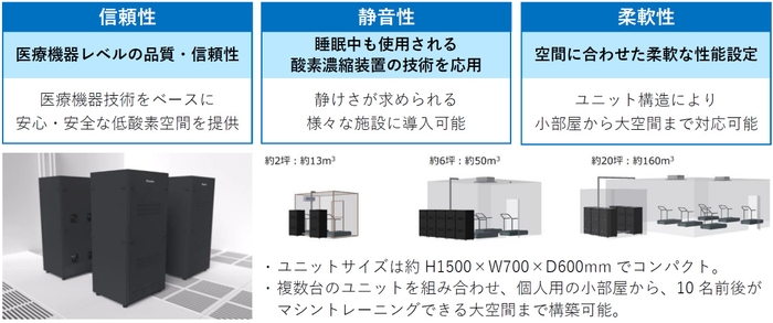 空気中の酸素と窒素を分離して酸素濃度をコントロールする技術を搭載した低酸素ユニットを、空間の大きさに応じて複数台組み合わせて構築するシステムです。ダイキン工業が従来から展開している医療用の酸素濃縮装置『ライトテック』の技術をベースにしたもので、信頼性、静音性、柔軟性に優れます。様々な規模の空間に活用できるほか、オフィス空間をはじめ、静けさを求められる場所にも適しています。また、酸素濃度を18%〜13%(標高1,200~3,900メートル相当)の範囲でコントロールできるため、用途に応じた低酸素空間づくりが可能です。