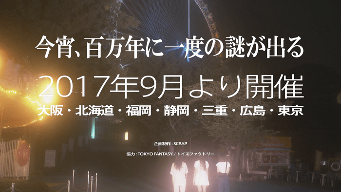 リアル脱出ゲームを企画運営する株式会社SCRAP(所在地:東京都渋谷区、代表者:加藤隆生)は、2017年9月9日(土)より大阪ひらかたパークを皮切りに全国の7つの閉園後の遊園地で開催する、リアル脱出ゲーム×SEKAI NO OWARI「竜の夜からの脱出」のCMを発表いたします。