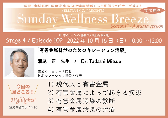 今回の講演は昨年に続き、日本キレーション協会とのコラボ企画第2弾として、昨今代替医療として注目されている「キレーション治療 / Chelation Therapy」について、満尾 正先生 / 満尾クリニック院長、日本キレーション協会代表による『有害金属排泄のためのキレーション治療』をZoomオンラインセミナーでお送りします。