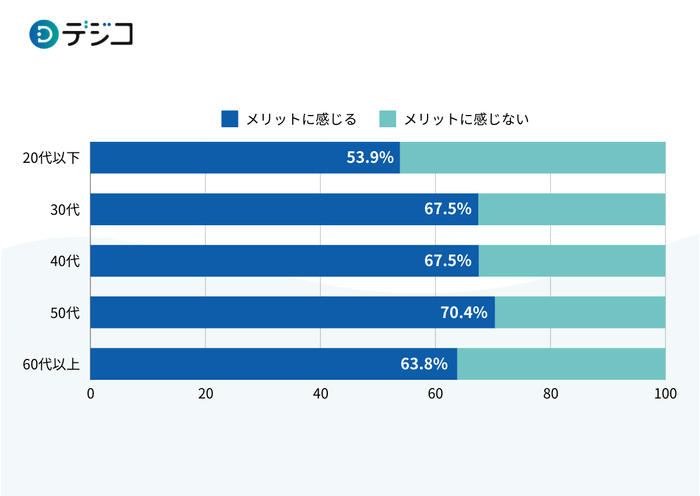 販促キャンペーンの景品が、「デジタルギフト」「電子ギフト」「オンラインギフト」の場合、その商品を購入するメリットに感じるか聞いたところ、全世代共通して半数以上が「メリットに感じる」と回答しました。また、シニア層に関しても63.8%が「メリットに感じる」と回答しました。