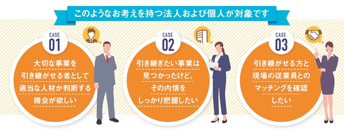 事業の売却を考える売り手と、事業を買いたい買い手をマッチングさせ、 事業運営のお試し期間を設けることで、両者の不安を払拭するお手伝いをいたします。