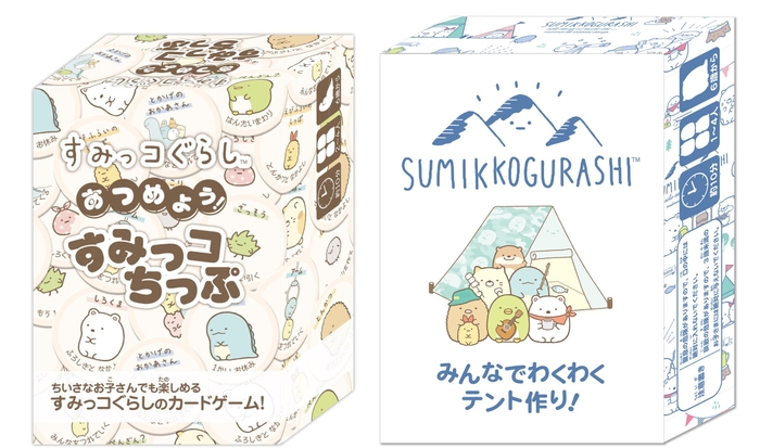 カードゲーム「すみっコぐらし あつめよう!すみっコちっぷ」は、小学生から大人まで楽しめる「坊主めくり」を題材にしたカードゲームです。「すみっコ」や「みにっコ」が描かれたチップを自分の『すみっこ』に集め、いちばん多くのチップを集めた人が勝利となります。もう一つの「すみっコぐらし~みんなでわくわくテント作り!~」は、「すみっコ」や「みにっコ」たちが「かわうそ」の力を借りて、みんなでテント作りを目指すカードゲームで、簡単な足し算と引き算を使ったルールで6歳から楽しめるゲームです。