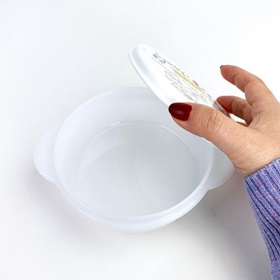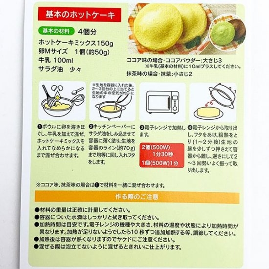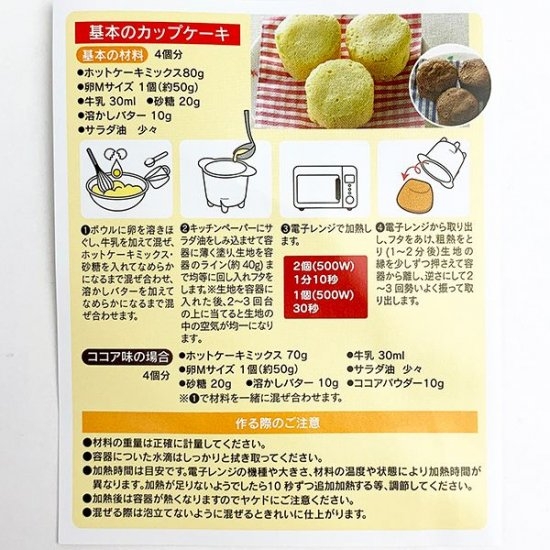 市販のホットケーキミックスや牛乳などの材料を混ぜ、ケースに注いで電子レンジで調理するだけの手軽さなんです。