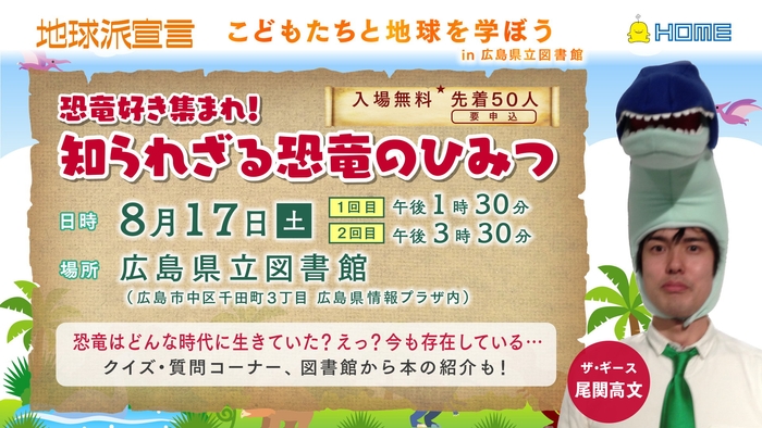 広島ホームテレビ(本社:広島市中区)は、2024年8月17日㈯、地球派宣言の「子どもたちと地球を学ぼう」イベントとして、「恐竜好き集まれ!知られざる恐竜の秘密」を実施致します。
