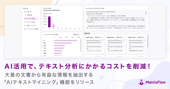 ビジネスのためのAI活用プラットフォーム「MatrixFlow」を提供する株式会社MatrixFlow(本社:東京都台東区、代表取締役:田本 芳文)は、アンケートや日報などの大量の文書から有益な情報を抽出する「AIテキストマイニング」機能をMatrixFlow上でリリースしました。
