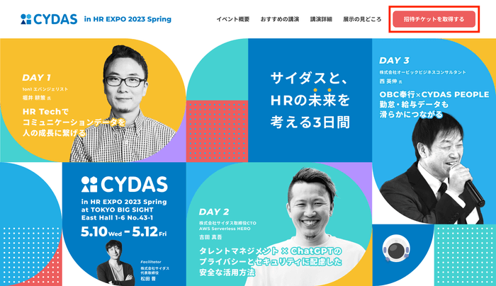 ① 特設サイトTOP(https://www.cydas.com/hr_expo2023/)の、「招待チケットを取得する」をクリックし、情報登録