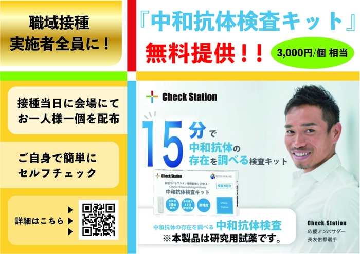 職域接種会場において、弊社の新型コロナ検査サービス「Check Station」で展開している①中和抗体検査(3,000円相当)を全員に無償提供いたします。