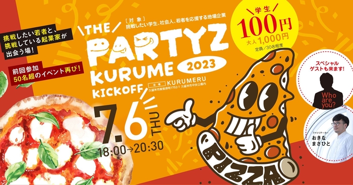 株式会社久留米ビジネスプラザ(所在地:福岡県久留米市)は今年度、久留米市と連携し次世代を担う若年層(大学生など35歳未満)の創業創出を図るため、創業コミュニティイベントを通した創業機運醸成のほか、専門人材による指導、伴走支援プログラムを実施。創業コミュニティイベント「The Partyz Kurume 2023 kickoff」を令和5年7月6日(木)に開催いたします。