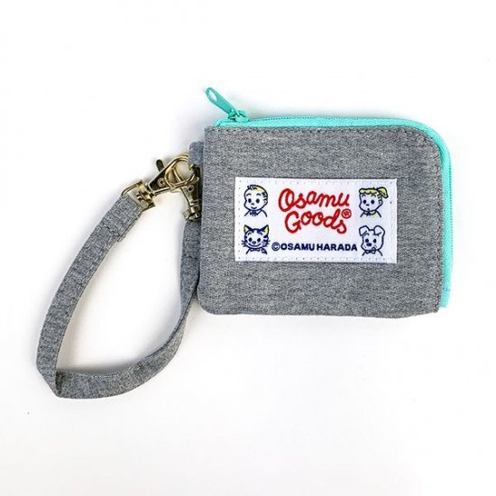 グレーのスウェット素材がカジュアルライクで、ミントカラーの縁取りがアクセントになっています。ストラップ付なので、バッグにも取りつけられますよ♪
