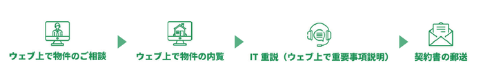 こうした時勢を受けてタウンハウジングでは、スタッフを物件に派遣しビデオ通話によるネット上での賃貸物件の内見を行う、オンライン内見サービスを開始。これにより従来展開している、チャットやビデオ通話による入居相談、ウェブ上での重要事項説明(IT重説)、及び郵送による契約書対応とあわせ、問い合わせから契約までを全て自宅で完結できるようになりました。