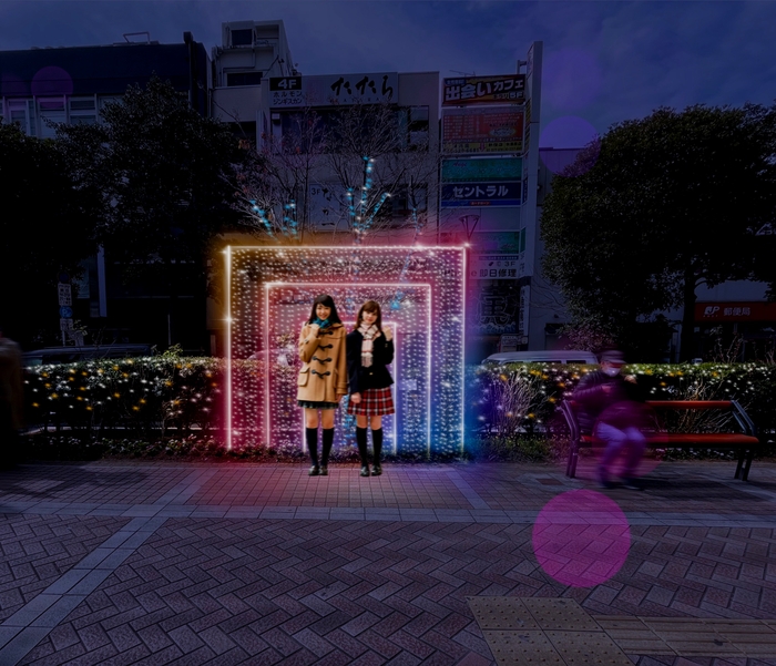 今回、若者が参加したくなるフォトスポットを意識し、訪れた人の目線で「まちを=イルミネーションを歩く楽しさ」という視点を加え、大屋根の下を歩いている時に見えるゲートの連続をモチーフ化。ただのゲートをモチーフにするのではなく、シンボルストリートである大屋根で見える景色をイルミネーションの象徴とし、デザインコンセプトを“ヨコハマイルミナスクエア”にしました。“ヨコハマイルミナスクエア”は、その名のとおりスクエアをモチーフにしたイルミネーションで、横浜駅中央西口駅前広場やみなみ西口エリア(相鉄口)、川沿い周辺エリア(横浜ビブレ前・ハマボール イアス前・一の橋~新田間橋間)を彩ります。また、スクエアの形状を活かしたフォトスポットも設置し、訪れた人がSNSなどで横浜の魅力を発信してもらう仕掛けも用意しています。