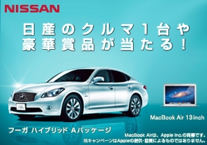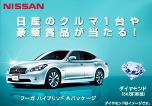 第1弾はフーガ ハイブリッド Aパッケージの登場を記念した「スマートな贅沢プレゼントキャンペーン」です。フーガ ハイブリッドのデザインと環境性能はそのままに、539.7万円(※1)からお求めいただけるフーガ ハイブリッド Aパッケージをはじめ、お好きな日産の人気のクルマが1台当たります。フーガ ハイブリッド Aパッケージの他に、2012年に生誕55周年を迎えるスカイライン、スカイライン クーペ、ティアナ、シルフィ、ムラーノ、エクストレイル、デュアリス、ジュークの中からお好きなクルマを選んでご応募いただけます。