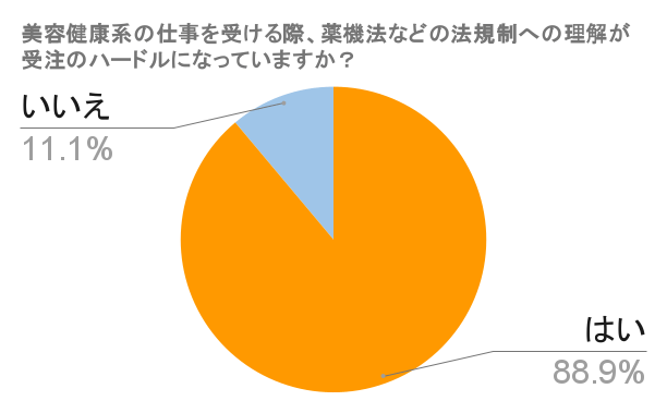 そこで、美容系の案件を請け負うクライアントワーカー36名を対象にしたアンケートを実施しました。「美容健康系の仕事を受ける際、薬機法などの法規制への理解が受注のハードルになっていますか?」という質問に対し、88.9%が「ハードルになる」と回答しました。また、「薬機法の知識やスキルがあれば、仕事が増える、単価が上がると思いますか?」という質問に対し、75%が「そう思う」と回答しました。そのほか「最新情報を取り入れるのが難しい」や「法規制に自信がないので案件を断る」など、美容案件を請け負う際に発生する悩みを吸い上げました。