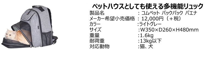 ベビー用品・乳幼児玩具などの開発・製造・販売を行うコンビ株式会社は、ペットのためのブランド「コムペット(compet)」から、日常使いから災害時にまで幅広く使えるペット用リュック「バックパック パエナ」を2019年8月下旬に発売いたします。